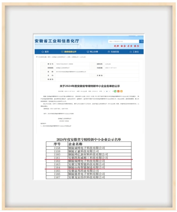 6、銅陵山海智能制造與安徽凱斯威精工科技,同獲“2024年安徽省專精特新中小企業(yè)”稱號(hào)。同時(shí)入選“安徽省科技型中小企業(yè)”;